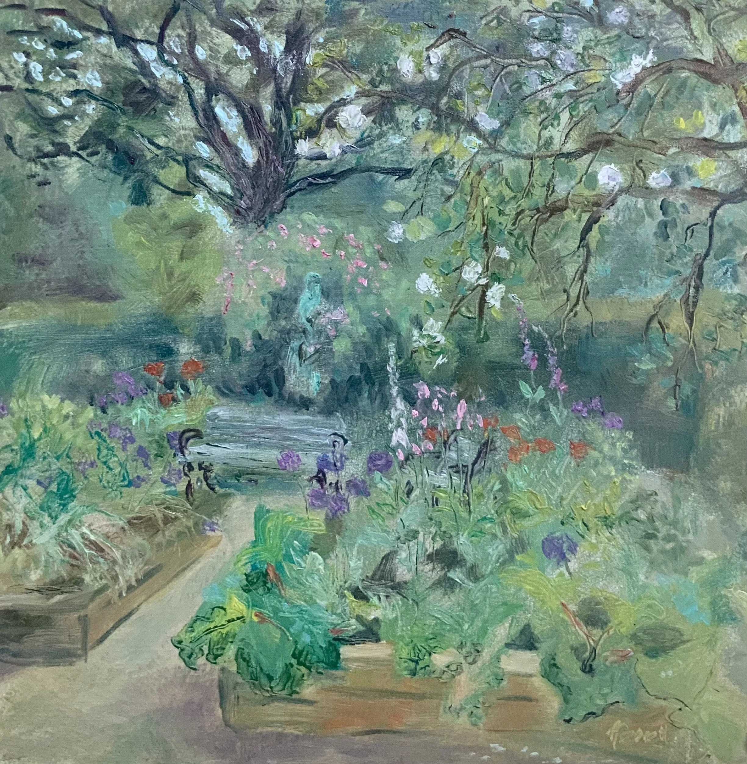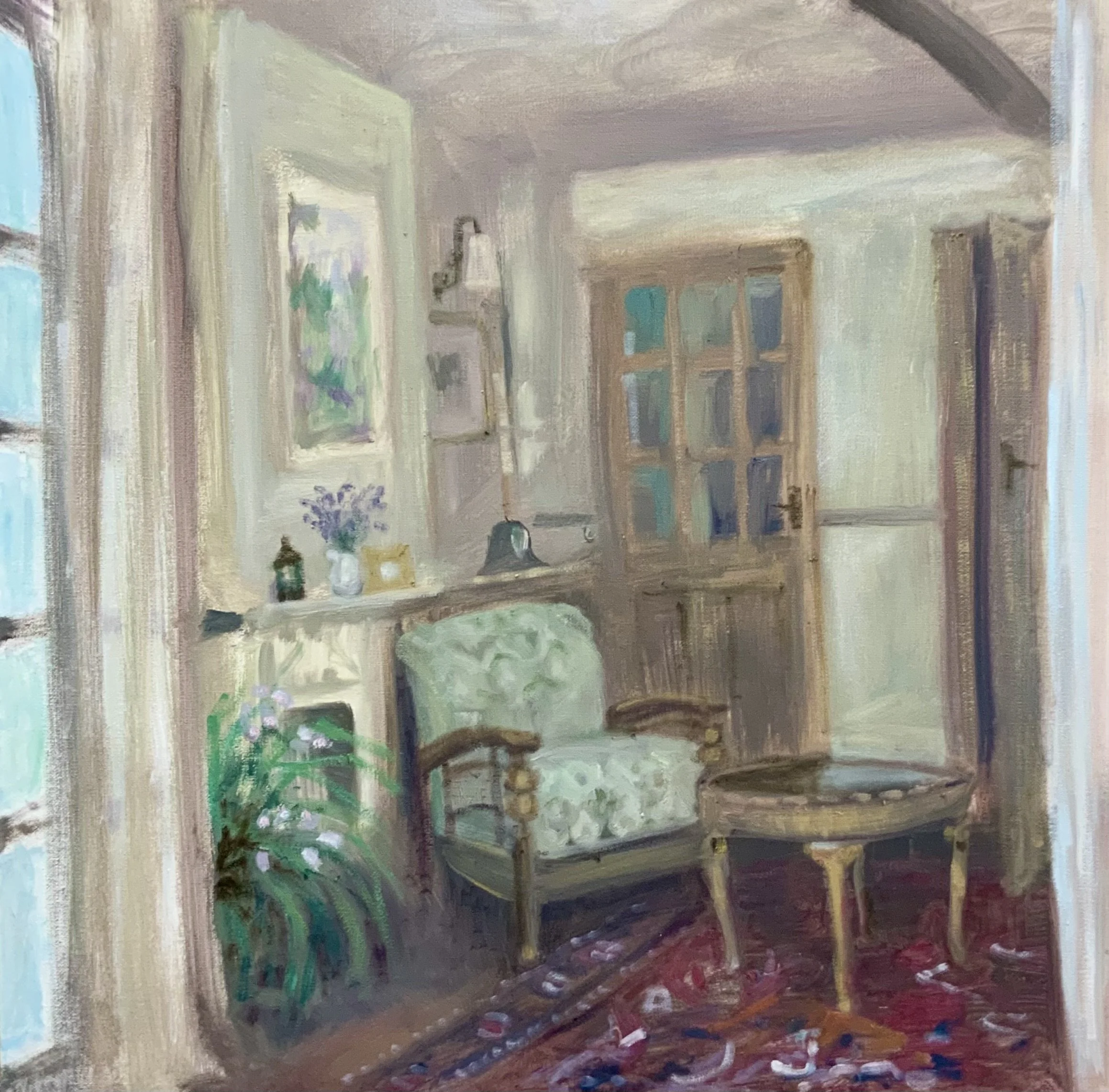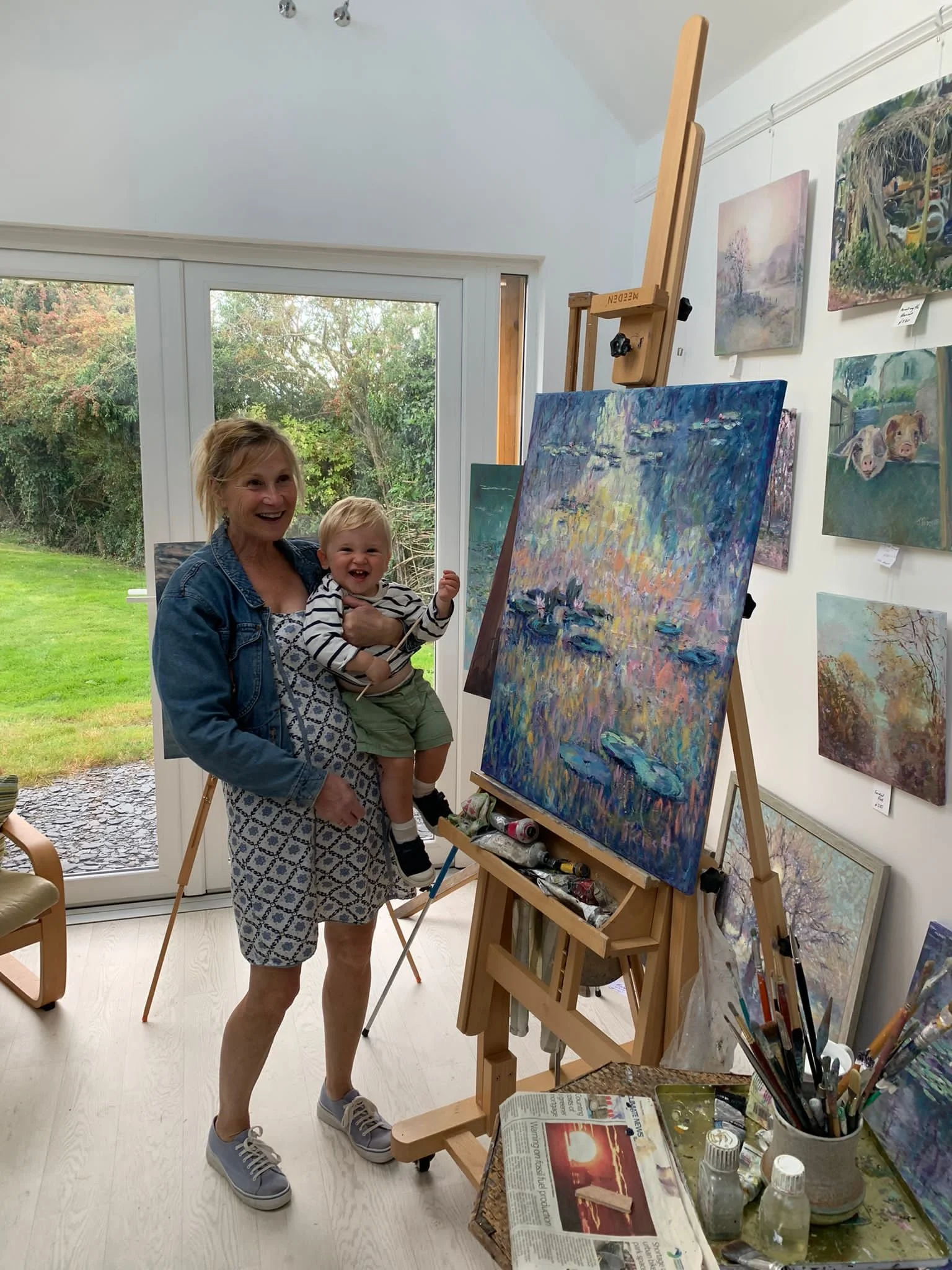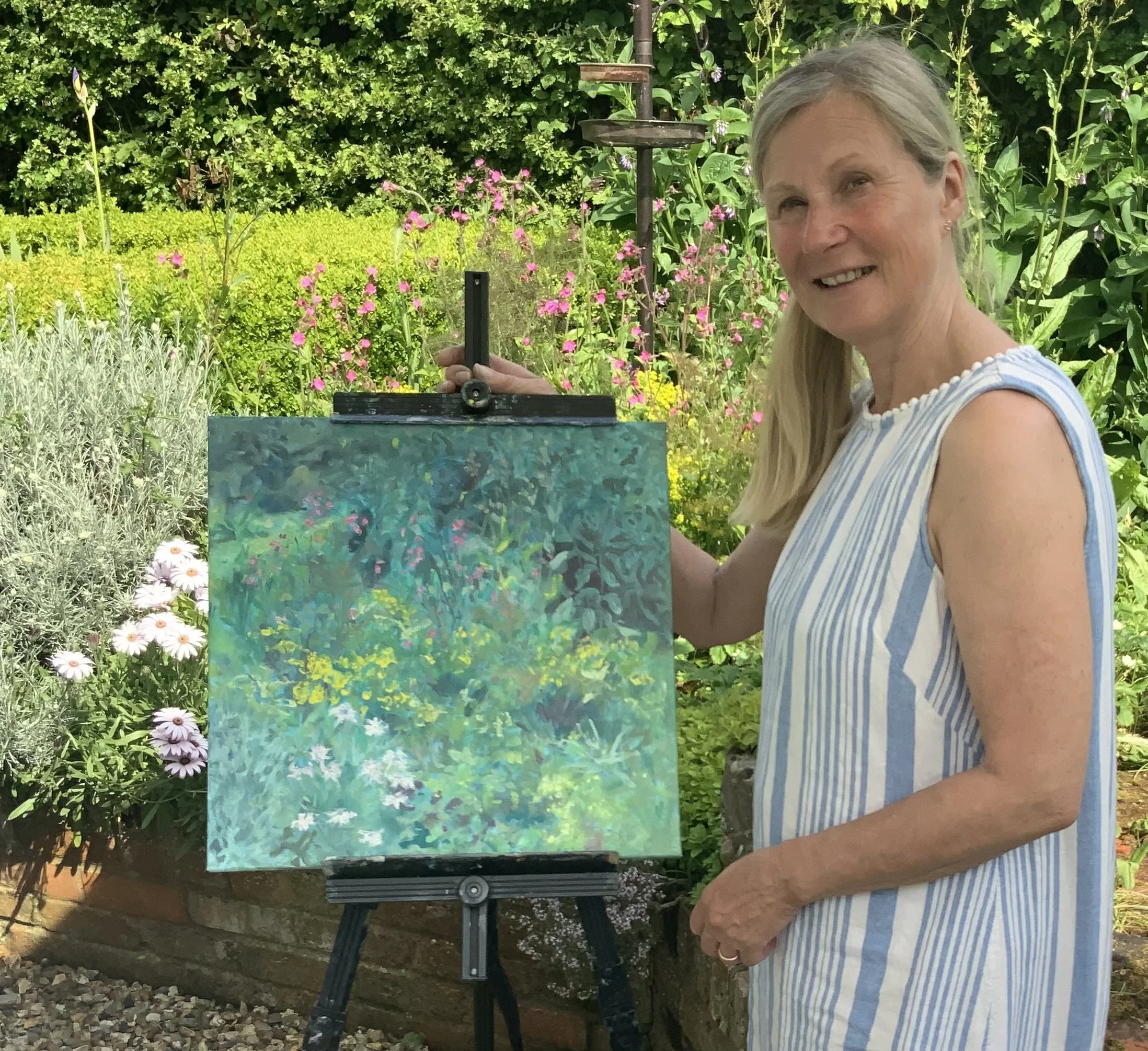 Jean Perrett, playing,painting, Poulshot, demonstration, oils,
