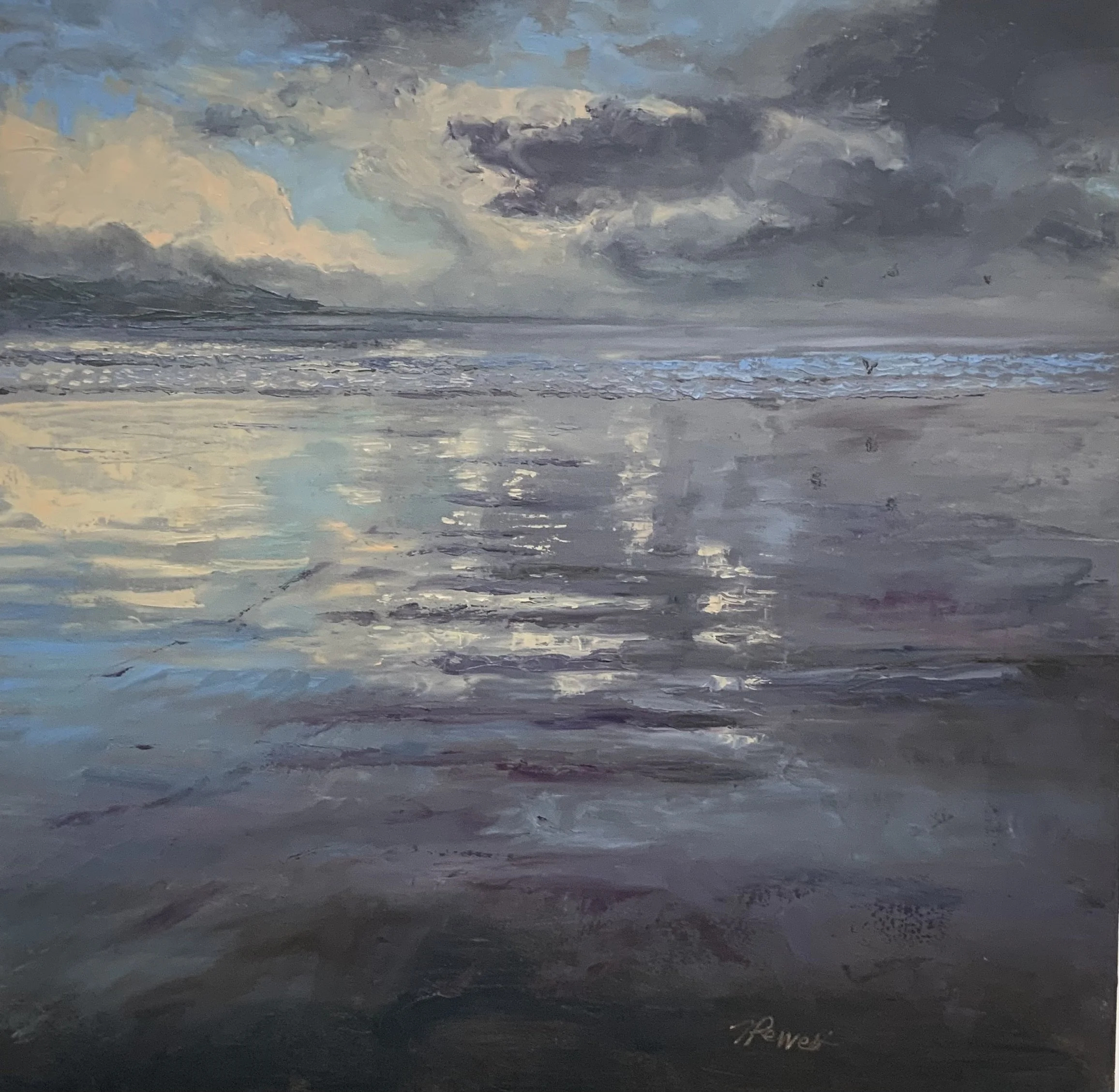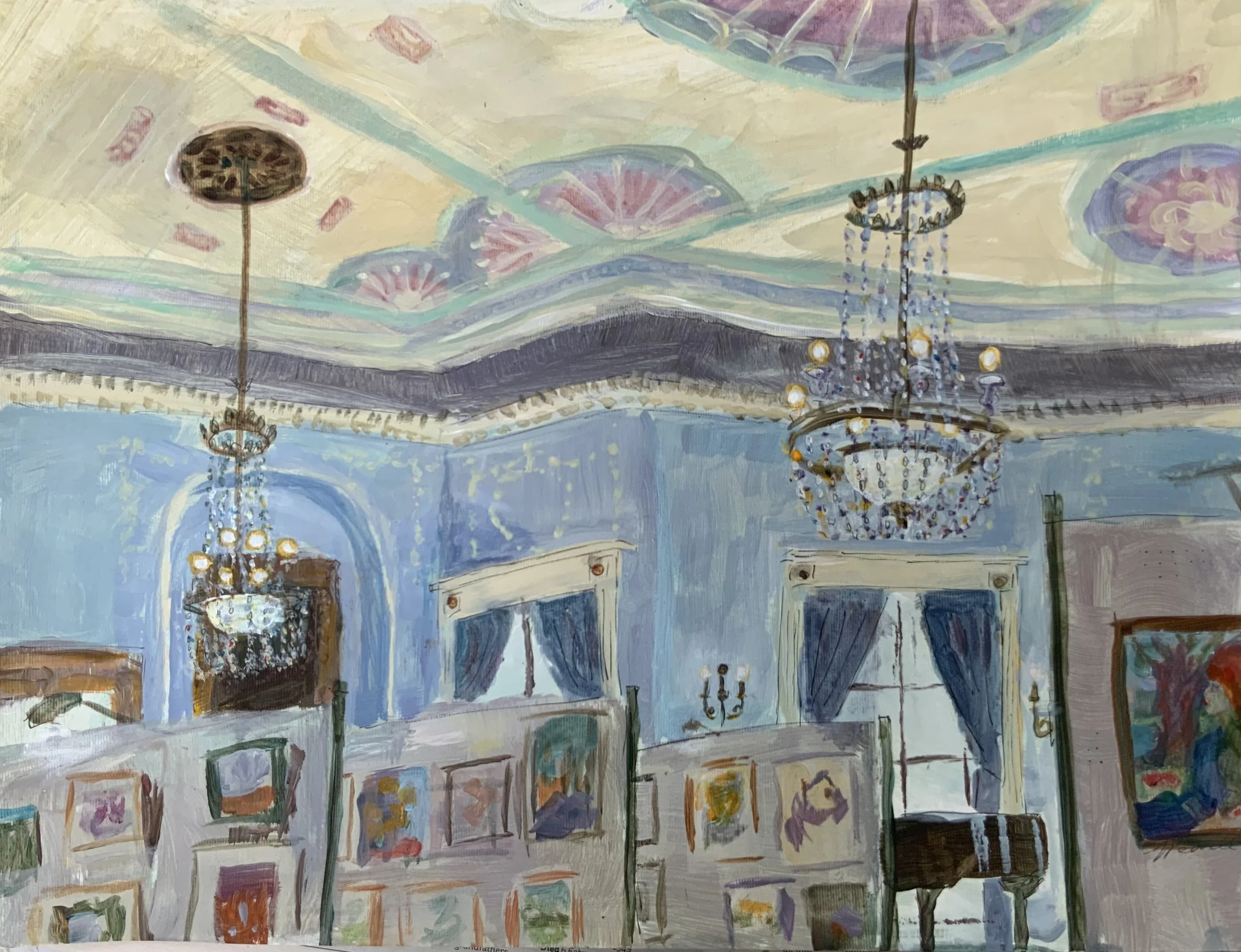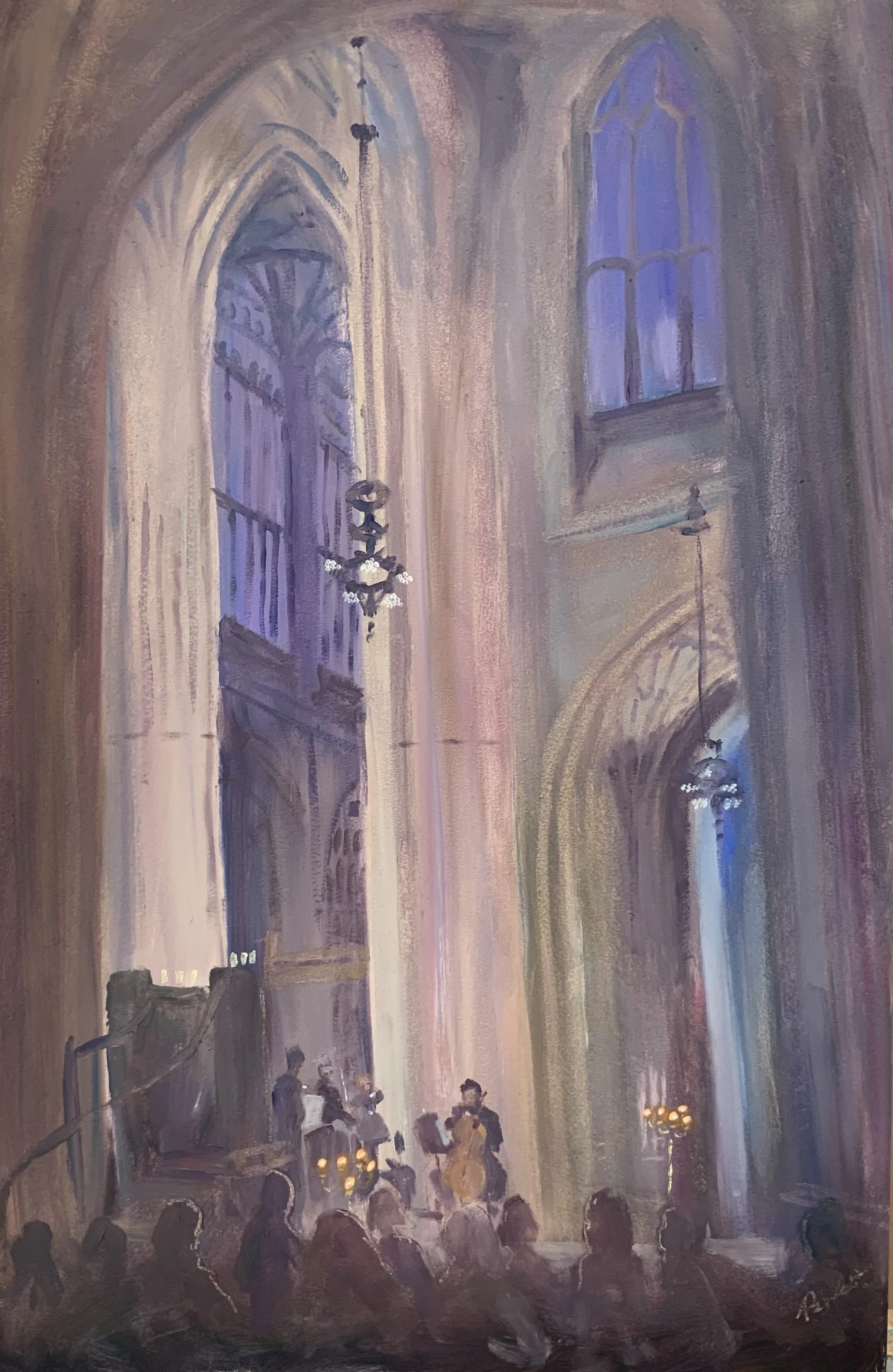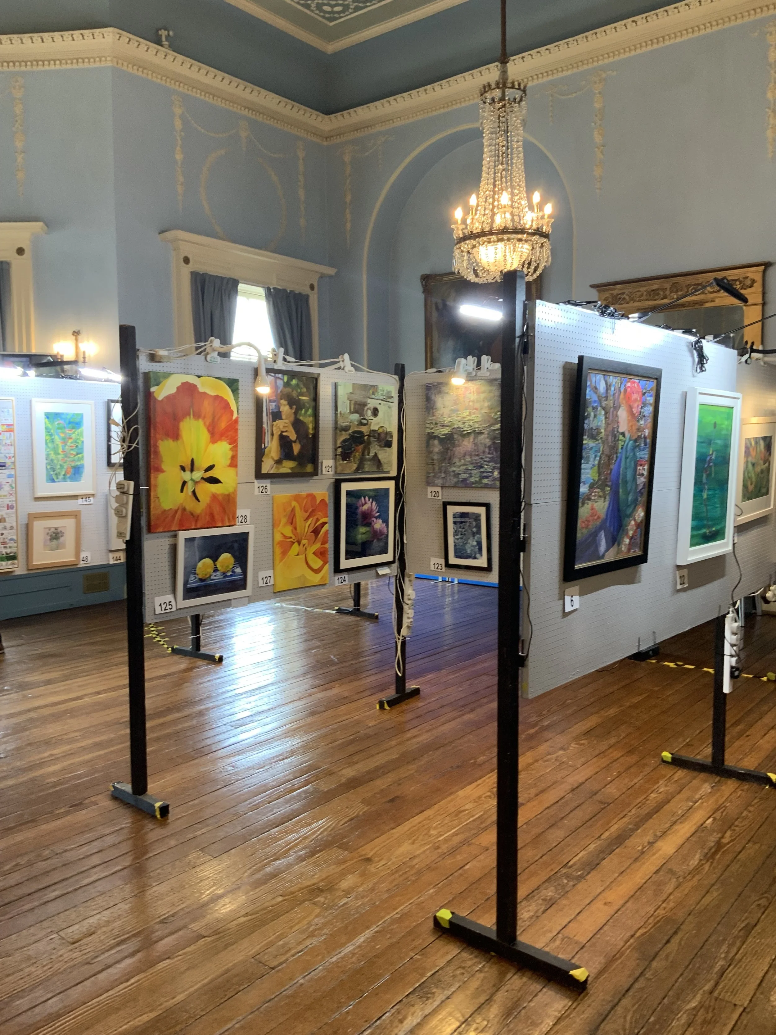 Jean Perrett, playing,painting, Poulshot, demonstration, oils,
